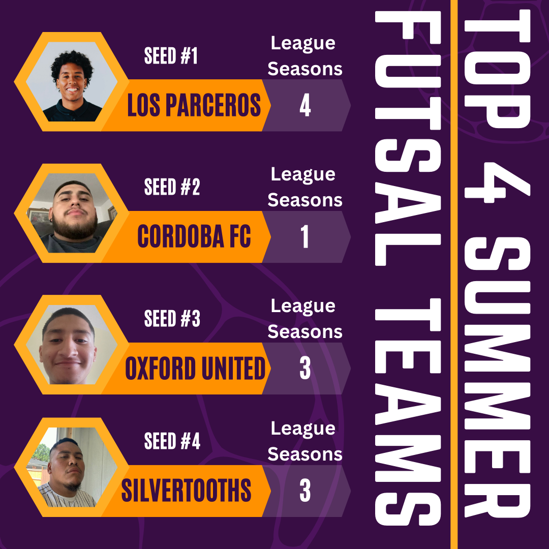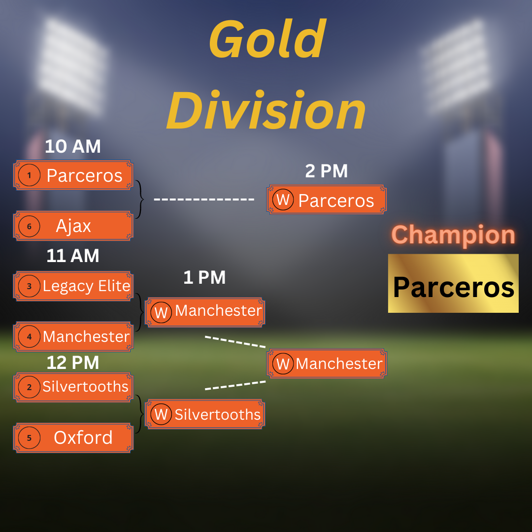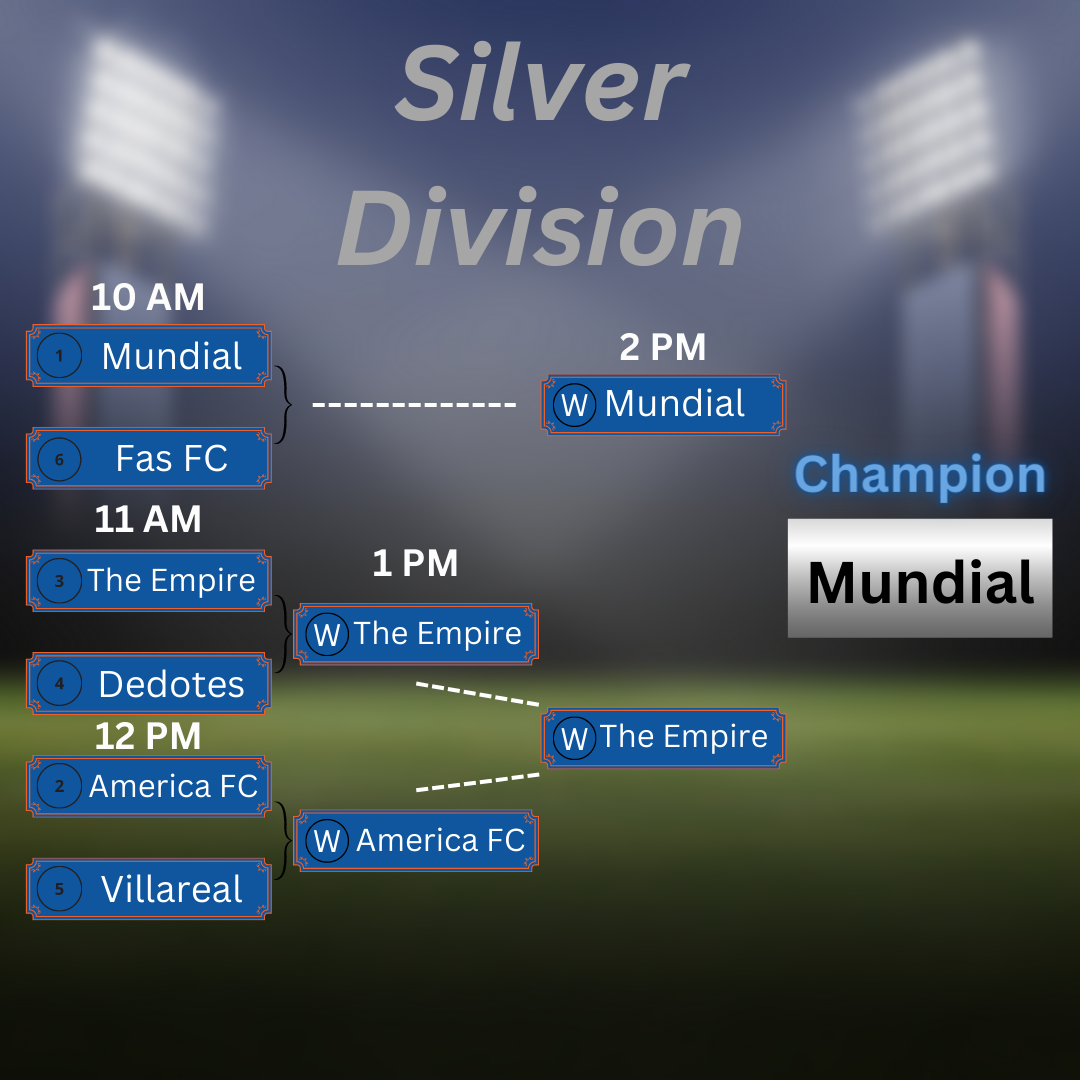 1. Ajax 2. Silvertooths 3. Legacy Elite 4. Oxford Fc. 5. Los Dedotes 6. Villareal 7. America Fc 8. Los Parceros 9. The Empire 10. Fas Fc de Santa Ana 11. Manchester 12. Mundial Fc