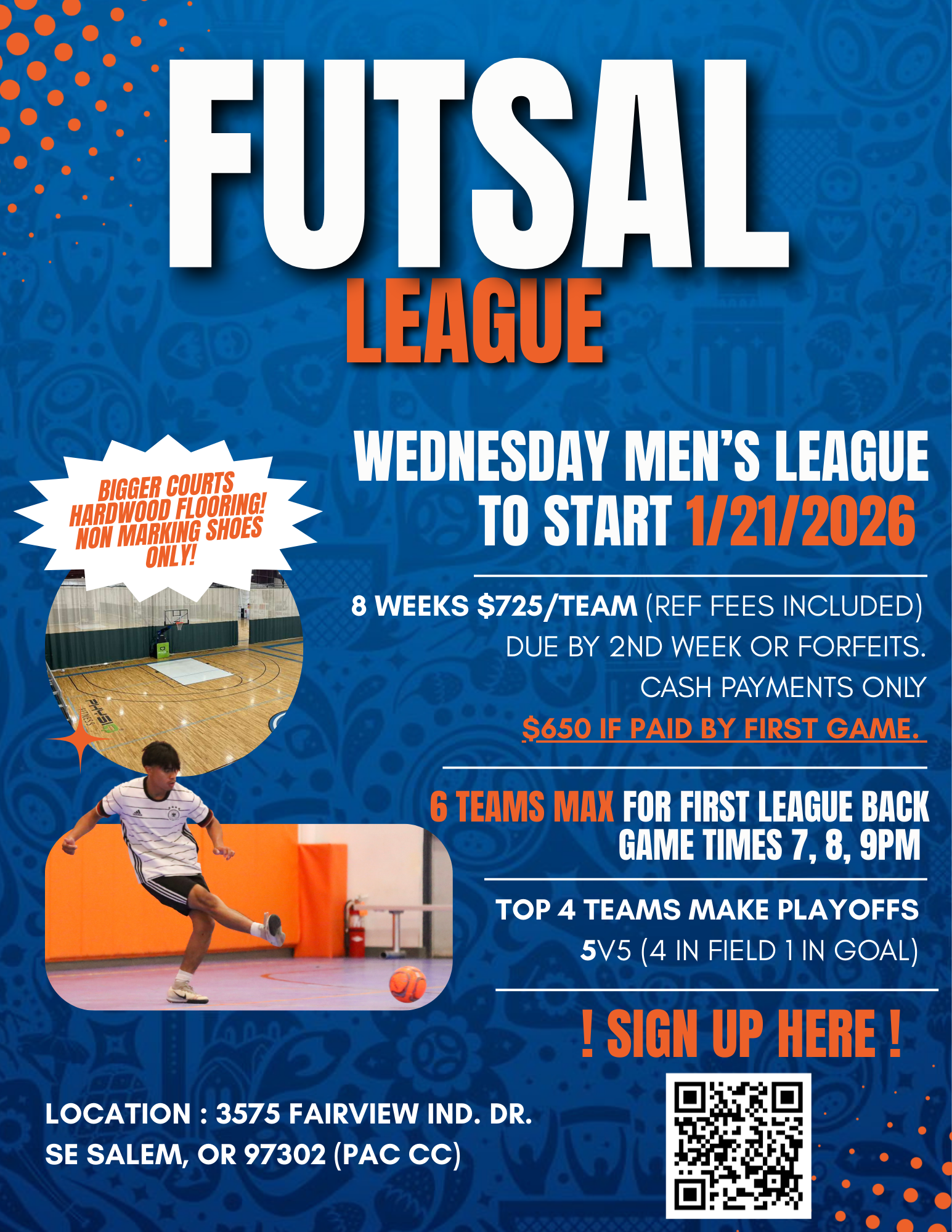 The Mid-Valley Futsal League is a competitive adult league in Salem, OR. Leagues typically last 8 weeks and are on Wednesday nights.